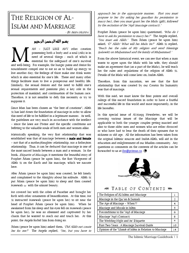 The first thing we should look for when marrying is how committed the person is to islam. The institution of nikah or marriage is the core of muslim family law. Proper witnessing is critical to the validation of the marriage, also acting as a protection against suspicions of adulterous relationships. The impact of islamic marriage contracts in the united states. In islam, marriage is considered both a social agreement and a legal contract.
